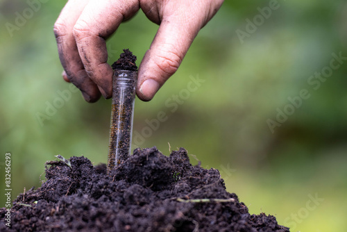 Fototapeta - regenerative organic farmer, taking soil samples and looking at plant growth in a farm. practicing sustainable agriculture.