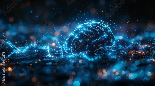An abstract blue polygonal brain hologram on a blurry background. AI and machine learning concept. 3D rendering.