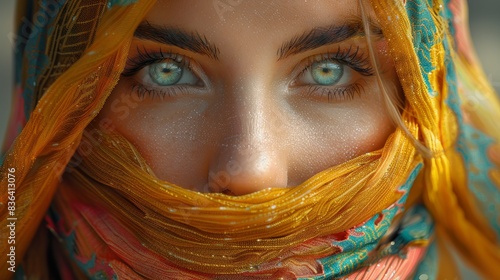 An AI-generated portrait of an arab woman in a colourful veil