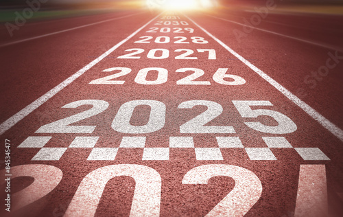 >Plakat>Start of new year. Changes of year 2025, 2026, 2027 on Running track. Concept of new ideas starting in new year, planning along with setting objectives to set KPI goals for success in life.