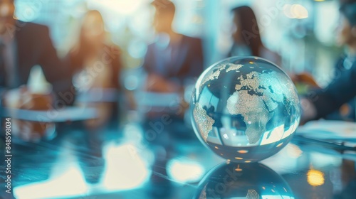 Fototapeta - Crystal globe on a reflective office meeting table with blurred silhouettes of businesspeople in the background.