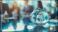 Crystal globe on a reflective office meeting table with blurred silhouettes of businesspeople in the background.