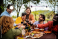 Fototapeta - Diverse friends enjoying outdoor dinner party with wine and tapas under string lights, multicultural group celebrating in garden
