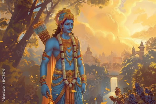 Fototapeta - An Illustration of young beautiful god rama standing in the garden