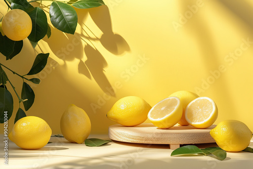 Fototapeta - Jasna cytryna przecięta na pół na pasującym żółtym tle. Miejsce na tekst