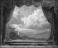 theatrical vintage stage with a landscape in the backdrop, rich and intricate details