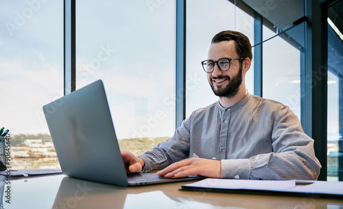 Fototapeta - A smiling young man in a suit sits in the office at a desk and works on a laptop, typing on a keyboard, texting, working with data