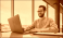 A smiling young man in a suit sits in the office at a desk and works on a laptop, typing on a keyboard, texting, working with data