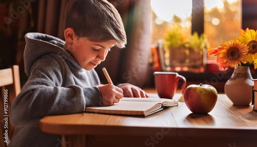 Chłopiec odrabiający pracę domową. Nauka, edukacja, rok szkolny
