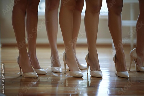 Fototapeta - Several beautiful women's legs are shown daintily posed near high heels on a hardwood floor.