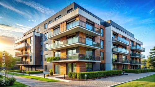 Modern residential apartment complex with sleek flat building exterior , urban, architecture, city, structure, design