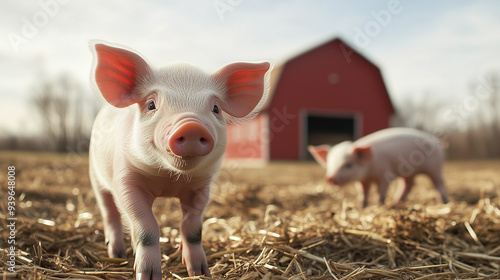 Fototapeta - Szczegółowe ujęcie małego, uroczego prosiaka stojącego na słomianym podłożu w oborze, z czerwonym budynkiem stodoły i innym prosięciem w tle.
