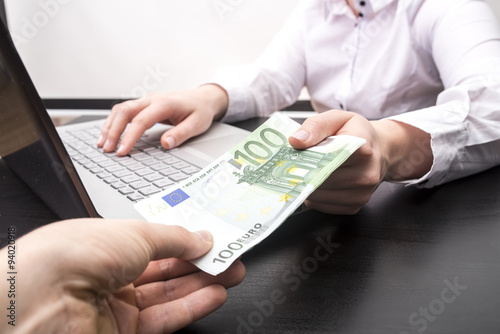 Fototapeta - Przekazywanie pieniędzy Euro kobiecie przy laptopie