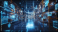 >Plakat>Wizualizacja przyszłościowego magazynu detalicznego, gdzie cyfryzacja i Przemysł 4.0 zmieniają sposób analizy towarów. Przestrzeń magazynowa jest wypełniona nowoczesnymi technologiami.