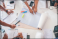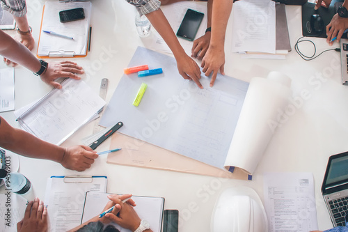 Fototapeta - Team of architects people in group on construciton site check documents and business workflow upper view