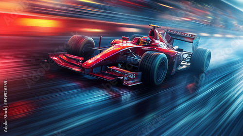 Samochód wyścigowy ściga się po torze w wysokiej prędkości, z efektem motion blur tła, który potęguje wrażenie prędkości i ekscytacji.