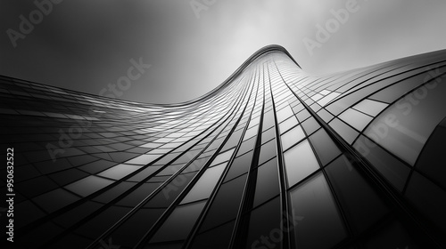 Fototapeta - Widok z dołu futurystycznego biurowca z zakrzywionymi szklanymi oknami. Imponująca architektura wznosi się ku niebu.