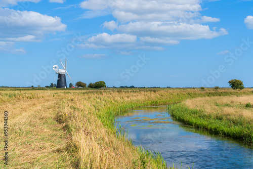 Fototapeta - Halvergate Windmill in the Norfolk Broads National Park in the UK in landscape orientation from a distance with Halvergate marshes