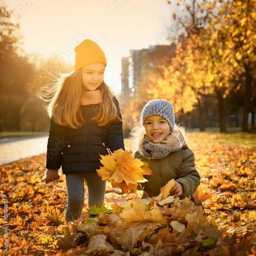 Dzieci bawiące się kolorowymi, jesiennymi liśćmi w parku