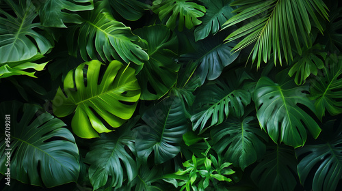 Fototapeta - Wspaniałe, zielone liście i roślinność tropikalnej dżungli oferują intensywny widok na bujną florę.