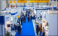 >Plakat>Aerial view of crowded trade show floor with numerous blue-themed booths and attendees walking through wide aisles, showcasing a bustling business exhibition environment