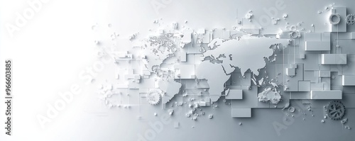 Abstract world map background with white color blocks and gears symbolizing global networks and technology