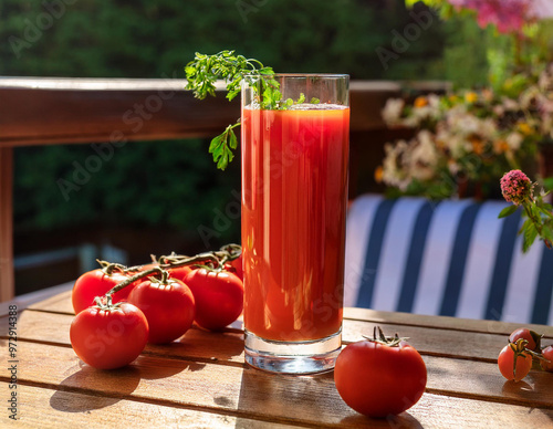 Fototapeta - zdrowy koktajl warzywny pomidorowy w wysokiej szklance i pomidory na drewnianym stoliku na słonecznym tarasie