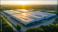 >Plakat>A vast warehouse complex showcases solar panels reflecting sunlight, nestled among trees and grassy areas during a picturesque sunset in an industrial zone