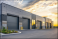 Modern industrial warehouse with large rolling doors at sunset