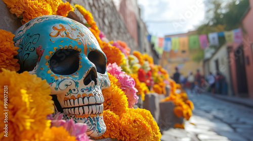 Fototapeta - Meksykańskie ulice zamieniają się w prawdziwą galerię sztuki z okazji Dnia Zmarłych. Wspaniałe dekoracje w formie kolorowych kwiatów, świec i tradycyjnych czaszek wypełniają przestrzeń.