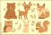 Cute flat vector illustration of forest animals featuring a bear, deer, fox, owl, rabbit, and squirrel among leaves and branches