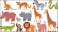 A collection of cute wild cartoon animals including a lion, giraffe, zebra, and hippo.