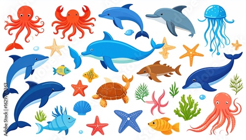 Fototapeta - Underwater aquatic cartoon animal collection featuring ocean inhabitants clipart
