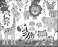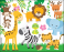 Vector illustration of cute safari animals including lion, tiger, elephant, monkey, zebra, giraffe, deer, snake, and hedgehog.
