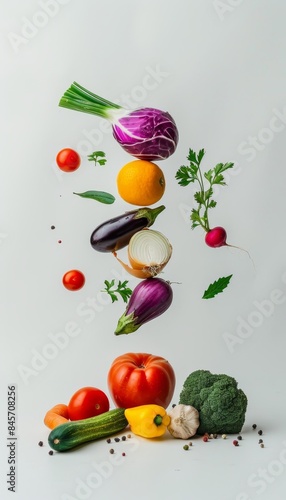Fototapeta - Assorted fresh vegetables floating on white background, creating a vibrant image