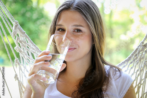 Fototapeta - Młoda kobieta pije wodę ze szklanki