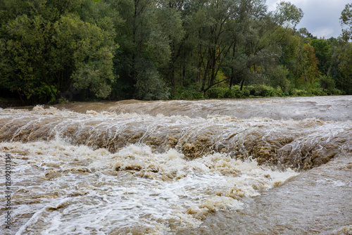 Fototapeta - Wezbrana po opadach deszczu rzeka Wisła , powódź