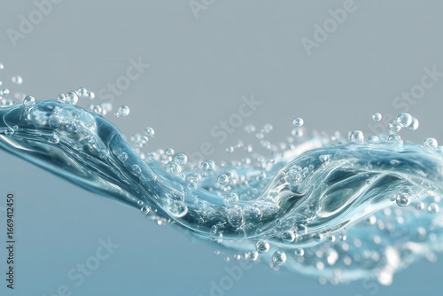 Fototapeta - Water wave with transparent surface displaying bubbles in motion above a calm blue backdrop during daylight hours