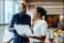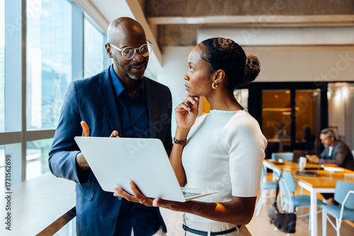 Fototapeta - Colleagues discussing a project using a laptop in an office setting