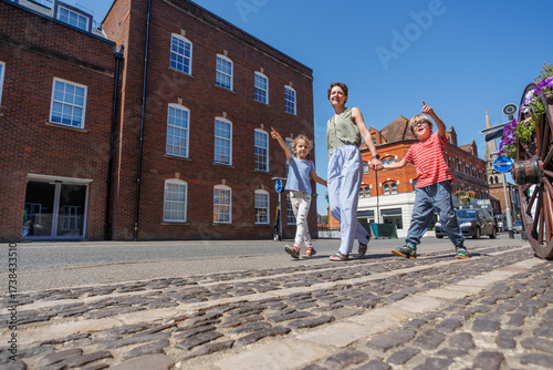 Fototapeta - Family of travelers enjoying pleasant sunny walk in Farnham, UK
