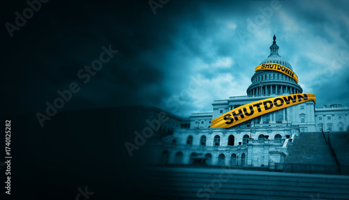 Fototapeta - American Government Shutdown and USA closed services and United States as federal shut down due to spending bill disagreement between the left and right with yellow hazard tape.