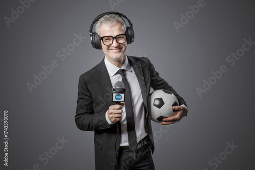 Fototapeta - Sports journalist holding a soccer ball and a microphone