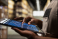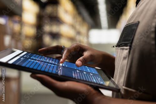 >Plakat>Tematy>Close up of industrial operations worker verifying parcel shipment details on tablet, order processing for cargo and inventory management. Transportation records for daily activities.