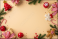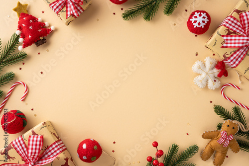 >Plakat>Tematy>Colorful Christmas setup with wrapped gift, candy canes, pine branch, ornament, and gingerbread figure creates warm holiday vibes and New Year greetings in soft beige background