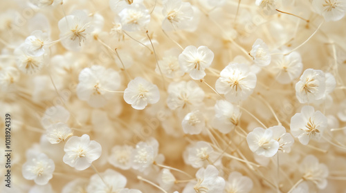 Fototapeta - Delikatne, suche białe kwiaty o subtelnych płatkach tworzą eteryczny, lekki obraz. Ich kruche, drobne formy w makro ujawniają misterną strukturę, nadając całej kompozycji delikatności i piękna.