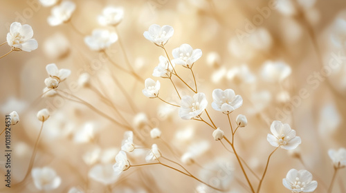 Fototapeta - Delikatne, suche białe kwiaty o subtelnych płatkach tworzą eteryczny, lekki obraz. Ich kruche, drobne formy w makro ujawniają misterną strukturę, nadając całej kompozycji delikatności i piękna.