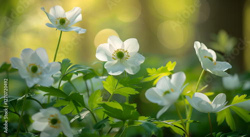 Fototapeta - Zawilce leśne w promieniach porannego słońca.
