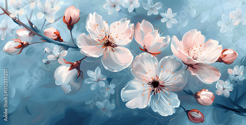 Kwitnąca gałąź wiśni w stylu malarskim na niebieskim tle.