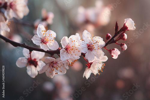 Fototapeta - Delikatne kwiaty zakwitły na gałęziach drzewa, zwiastując wiosnę. Pełne życia pąki rozświetlają zielone tło, tworząc piękny, naturalny obraz odrodzenia i świeżości.