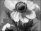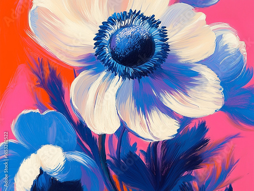 Abstrakcyjny obraz, na którym znajdują się białe i niebieskie kwiaty z niebieskimi środkami oraz liśćmi na jaskrawo-pomarańczowym tle.